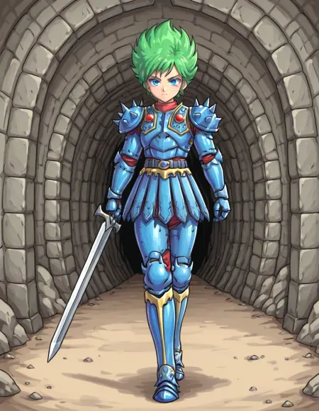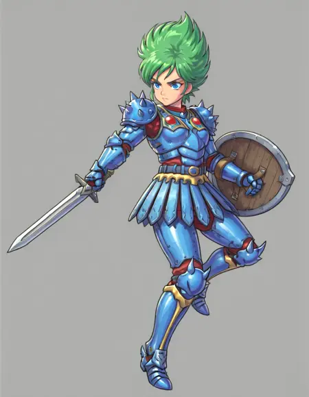 xana2,1girl,blue eyes,green hair,spike hair,short hair,small breasts,armor,gauntlet,armored boots,red shirt,red pants,shoulder spikes,