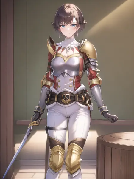 需要short_hair, brown_hair, ear_ring作为基础词条, 如果要还原游戏中的外观就再加上OfficialOutfit, armor, trouser, knee_pad