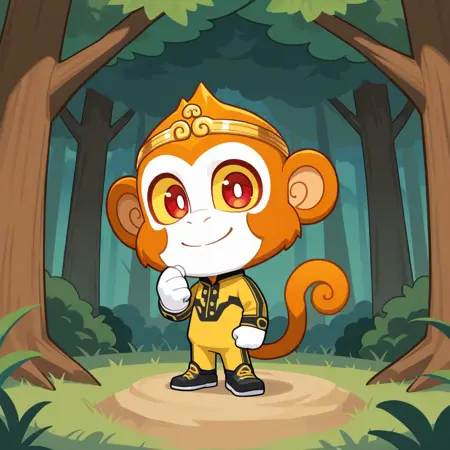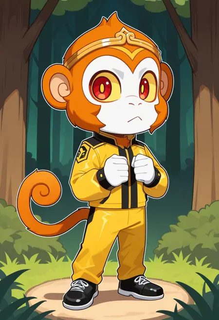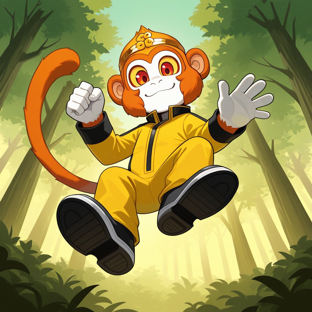 tianshengAC, anthro, furry, monkey, solo, male, orange fur, white face, white hands, yellow sclera, red eyes, golden head ring, curled tail, yellow dragon suit, black details, dark shoes