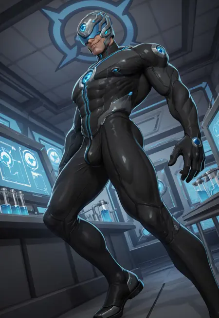 MR_R33D, Helmet, blue visor, lips, black bodysuit