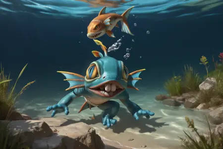 Trigger : solo, teeth, pokemon (creature), fangs, turtle, holding, fish, murky (creature)