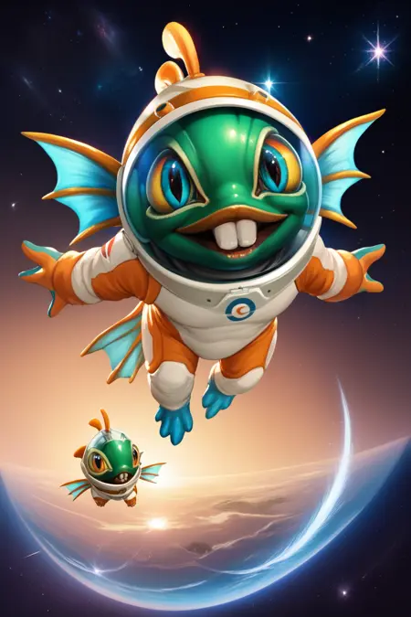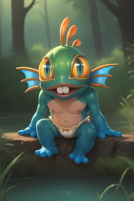 Trigger : murky, fins, chibi, pokemon (creature), diaper, open mouth, teeth, no humans, holding, fish