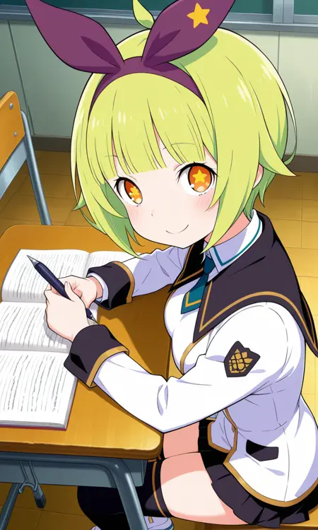 엘리 외모: 1girl, 중간 크기의 가슴, 단발, 진한 주황색 눈, 리본, 아호게, 헤어밴드, 녹색 머리, 기호 모양의 동공, 별 모양의 동공, 보라색 헤어밴드, 리본, 헤어 리본, 머리 리본, 둔한 앞머리