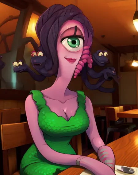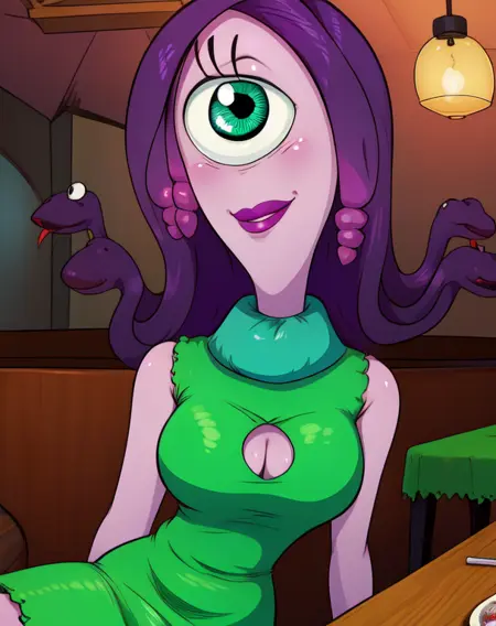 Celia, クモの巣のような髪、ピンクの肌、独眼、または片目, 緑色の目、まつげ、
