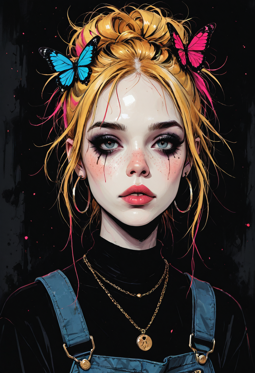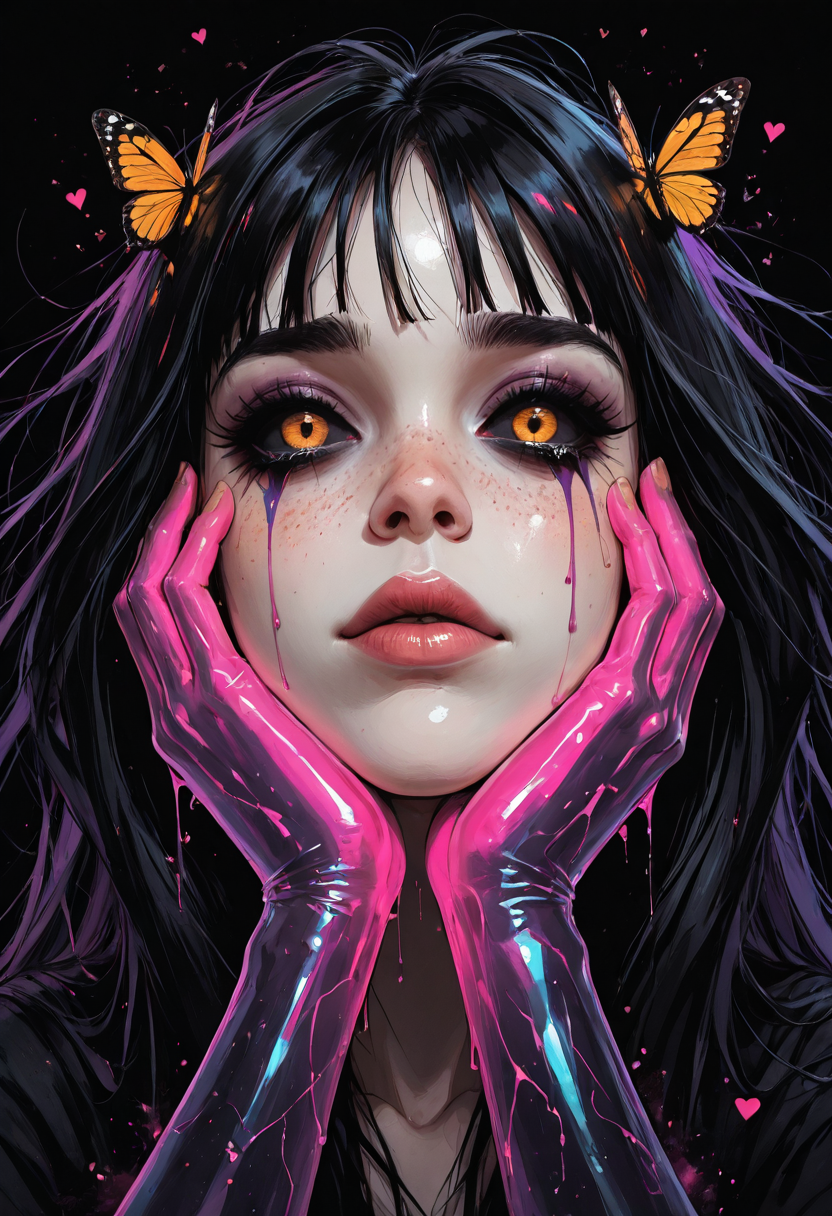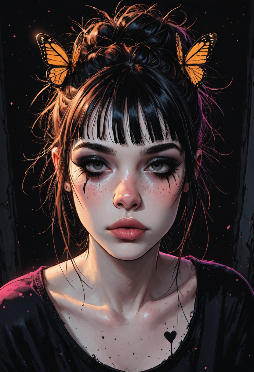 CRYB4BY, goth girl, pale skin, heavy black smokey eye makeup, glossy lips, makeup streaks under the eyes, freckles, messy punk hairstyle with spiky fringe, grunge illustration, comic art style, highly detailed, cinematic lighting, ultrasharp, 8k, butterflies, marks in the form of hearts,