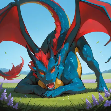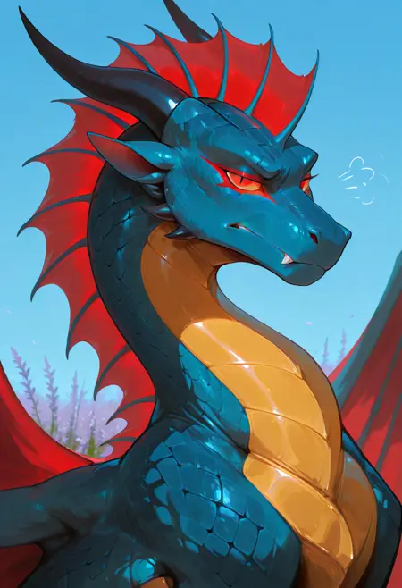 metfar_lv, dragon, horns, tail, fangs, blue scales, makeup, red wings, red eyes, yellow sclera, yellow underbelly