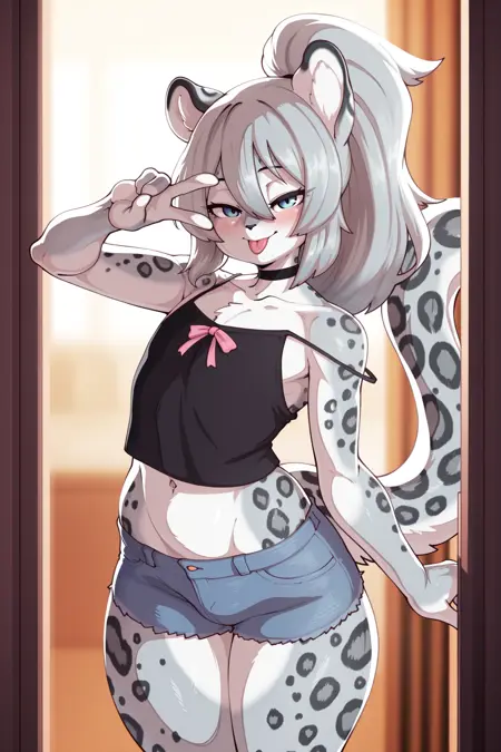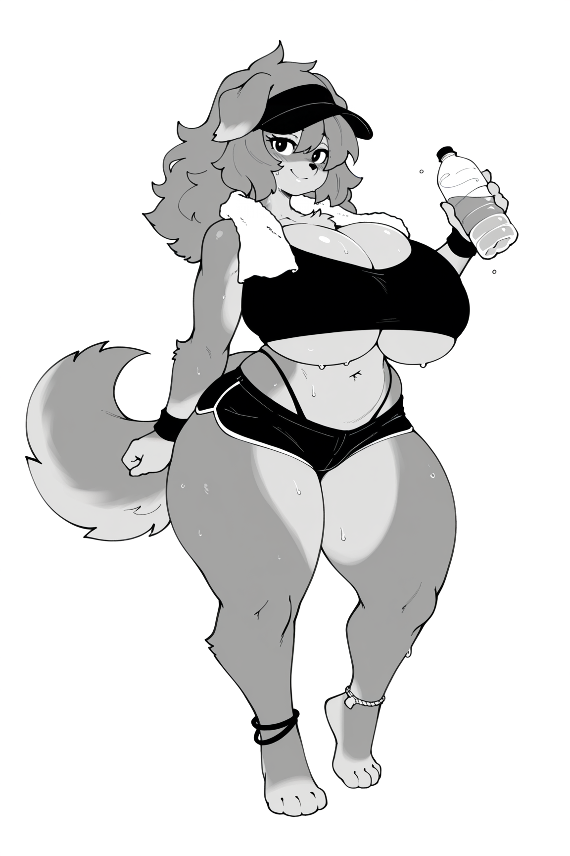 masterpiece, best quality, amazing quality, very aesthetic, high resolution, ultra-detailed, absurdres, newest, scenery, depth of field, scenery, volumetric lighting, by dmxwoops, monochrome, greyscale, furry, furry female, anthro, animal ears, animal nose, snout, zootopia, judy hopps, lagomorph, rabbit, dark grey eyes, grey fur, body fur, 1girl, solo, huge breasts, underwear, cleavage, black panties, navel, black shirt, looking at viewer, blush, open mouth, teeth, tongue, one hand on hips, tigh gap, highleg panties, camel toe, crop top, voluptuous, curvy figure, white background