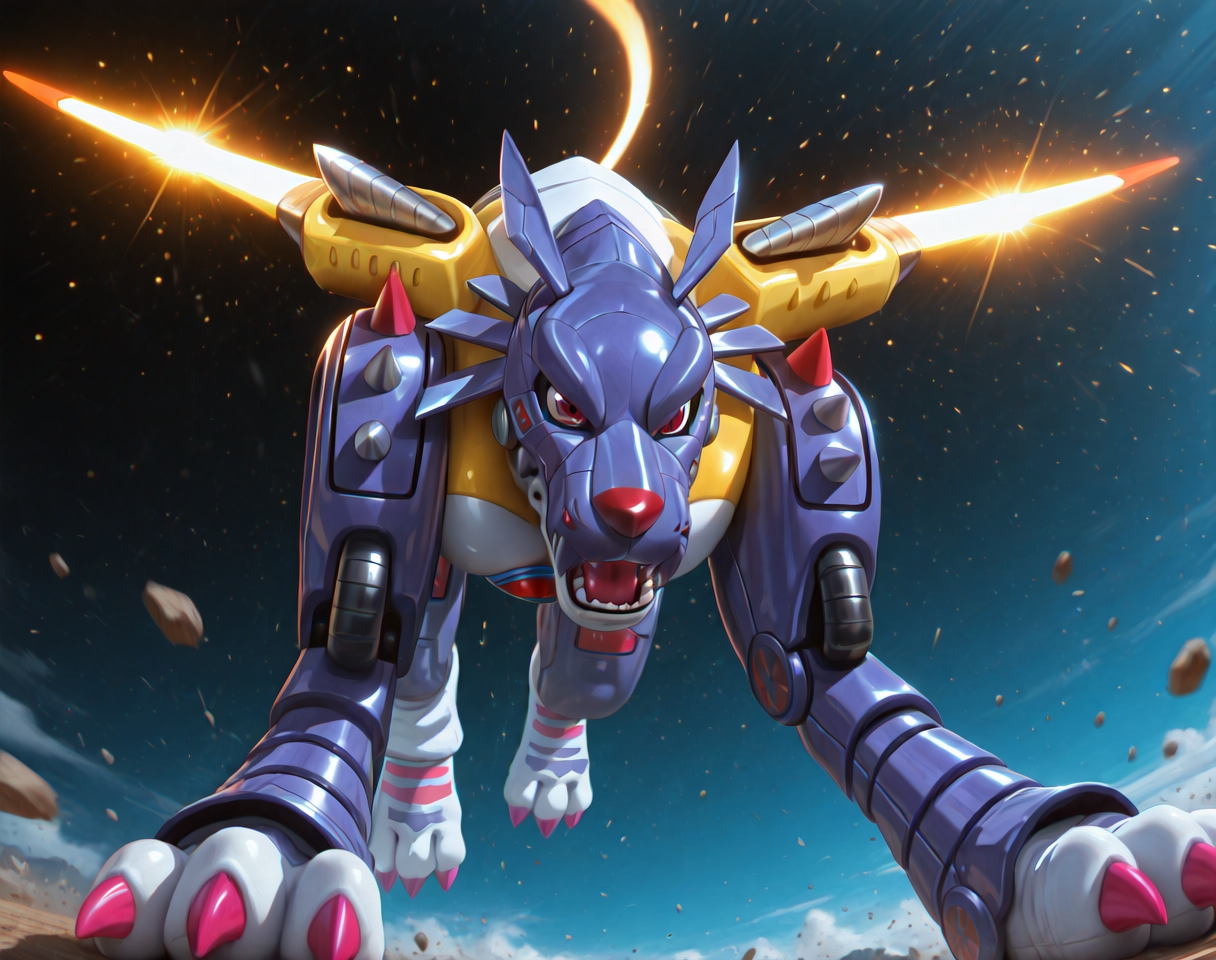このLoRA向けのプロンプトは(Metalgarurumon, robot, wolf, Digimon, )です。