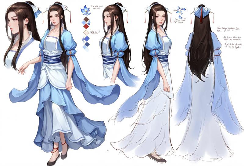 hair bun, hair ornament,hair bow,dress,white dress,puffy sleeves,long sleeves,chinese clothes,bow,hanfu,ribbon,blue dress,sash,wide sleeves,anklet,flats