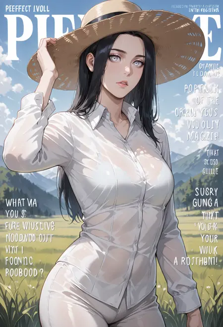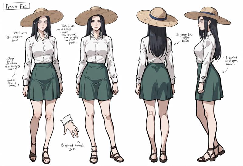 hat,straw hat,shirt,white shirt,collared shirt,long sleeves,dress shirt,breasts, green skirt, wing collar