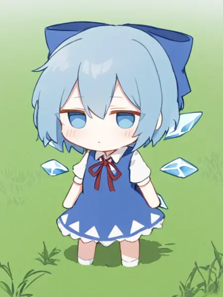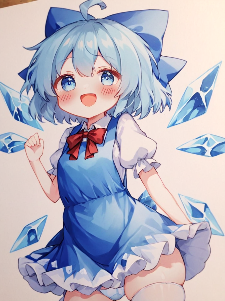 cirno,blue_eyes,collared_shirt,short_hair,white_shirt,blue_hair,hair_bow,blue_dress,dress,ice_wings,red_ribbon,neck_ribbon,
