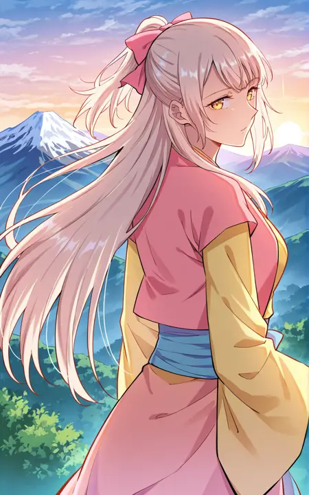 Youqin_outfit, pink vest, sleeveless vest, open vest, yellow kimono, long kimono, pink trim kimono, long sleeves, wide sleeves, blue inner top, blue waist sash, long waist sash, large waist ribbon, pink overskirt, short overskirt, asymmetrical overskirt, yellow underskirt, long underskirt, pink shoes