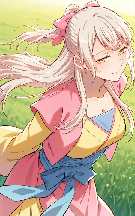 Youqin, 1girl, solo, golden eyes, pale blonde hair, long hair, straight bangs, hair between eyes, long sidelocks, half ponytail, pink hair ribbon,