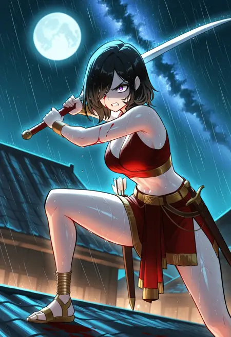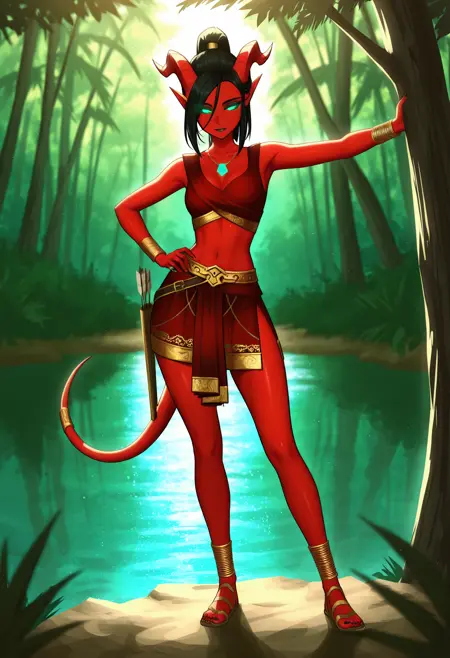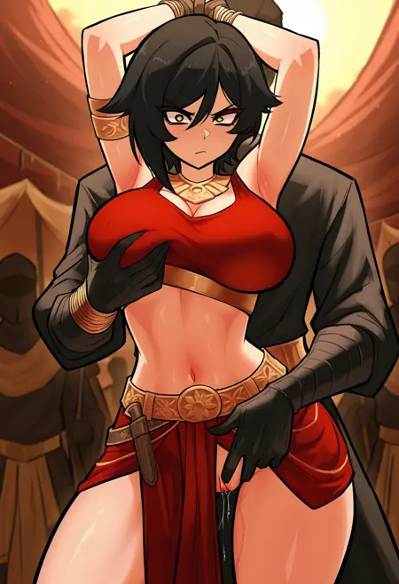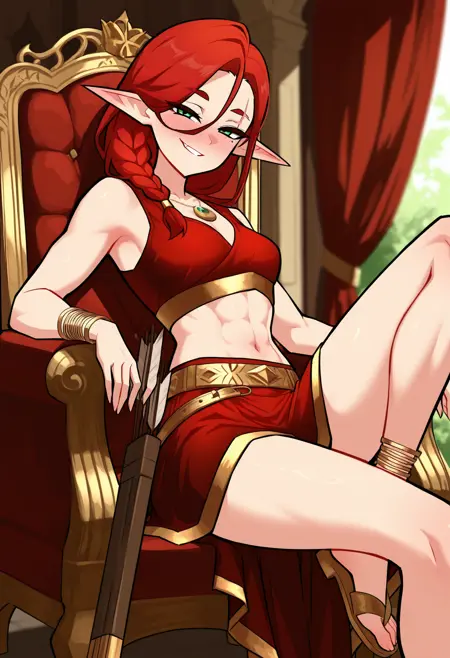 Outfits: golden bracelets, golden belt, red top, crop top, red skirt, short skirt, asymmetrical skirt, satin clothes, golden trim, cleavage.