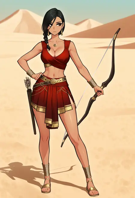 Character: ph0r0pr1nc3sand,1girl, black hair, single braid hair, bangs, brown eyes, long hair, mascara, earrings, tan,