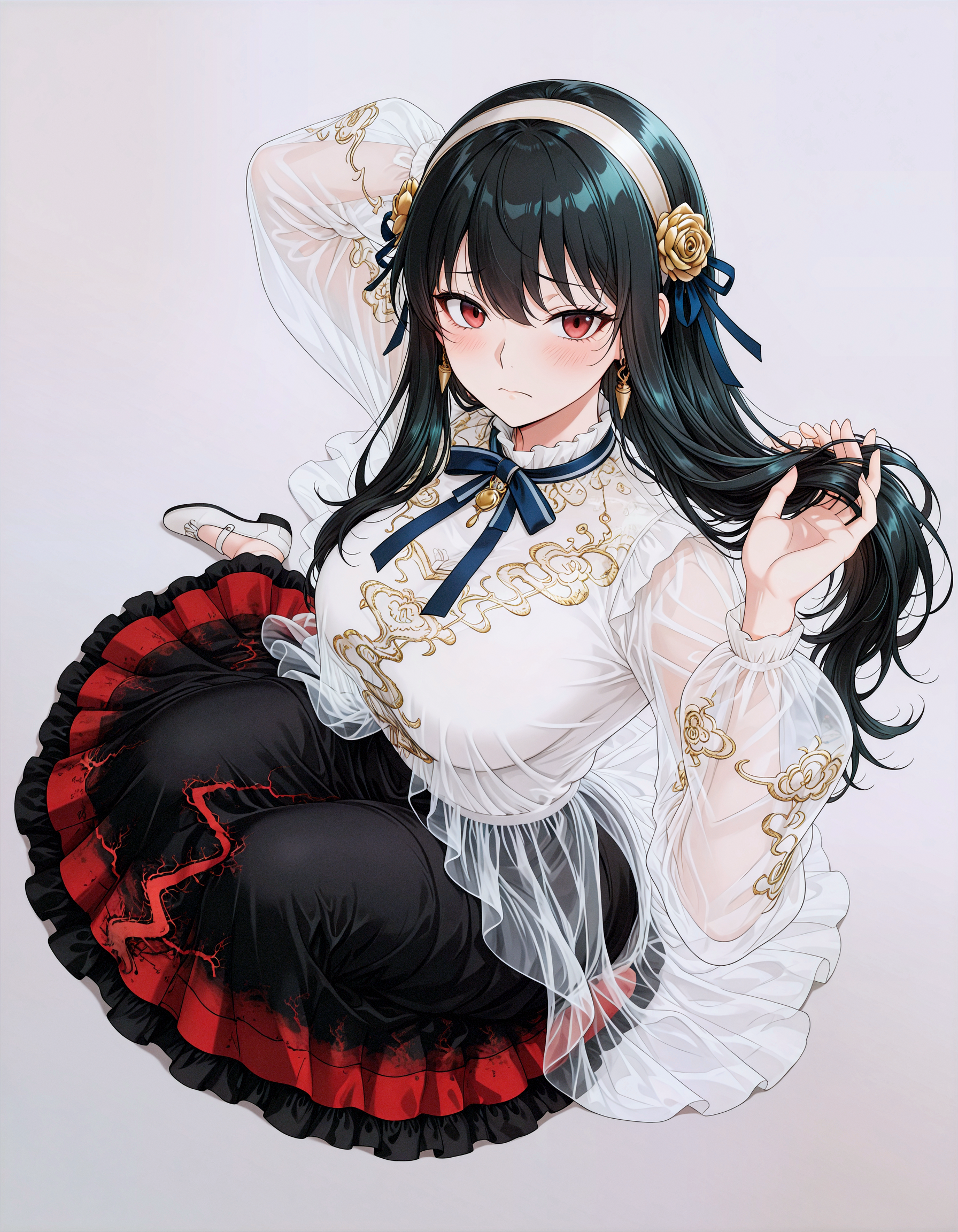 金色の雲が刺繍された白いチュールが、「運命の軽やかさ」を空から降り注ぐ柔らかなベールのように織りなす。黒赤の灰の模様が、「冥界の静けさ」をぼやかし、スカートにわずかに輝く灰のようにあらわれる。透き通る外層が、内側の炎のような模様を包み込む。これは「灰を隠しながら運命に従い、冥界とつながりながら静けさを保つ」という含蓄的な表現である——軽さと重さ、柔らかさと強さが、一枚のドレスの層の中に隠されている。