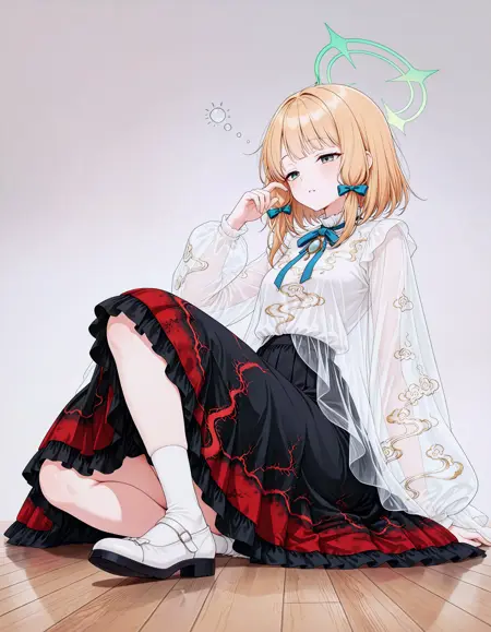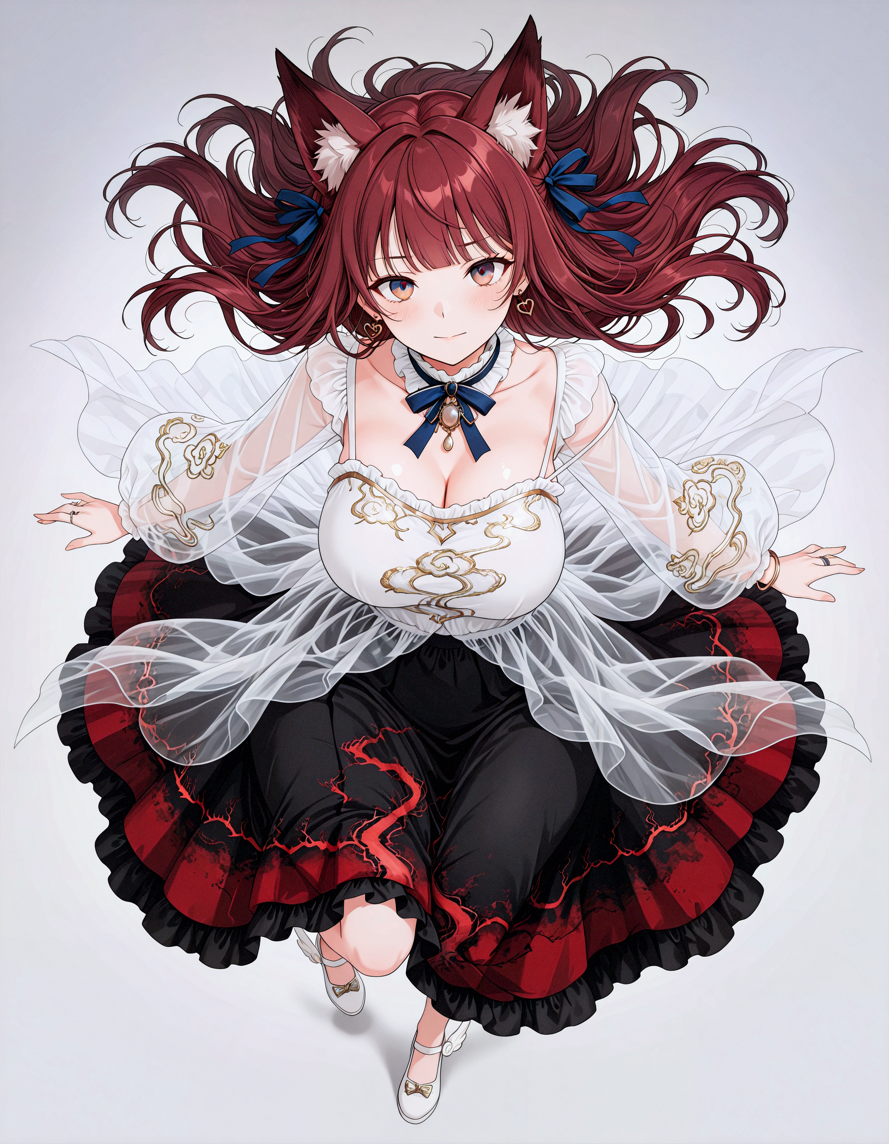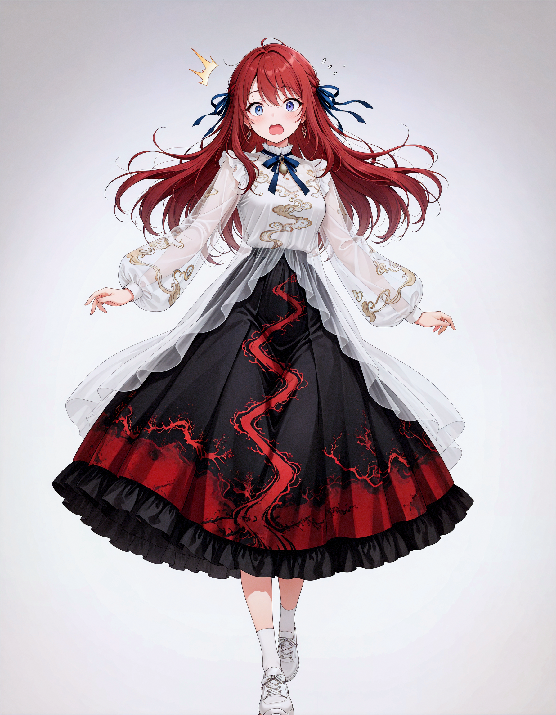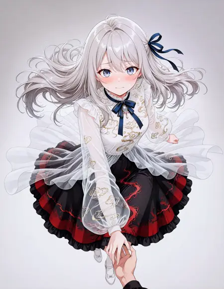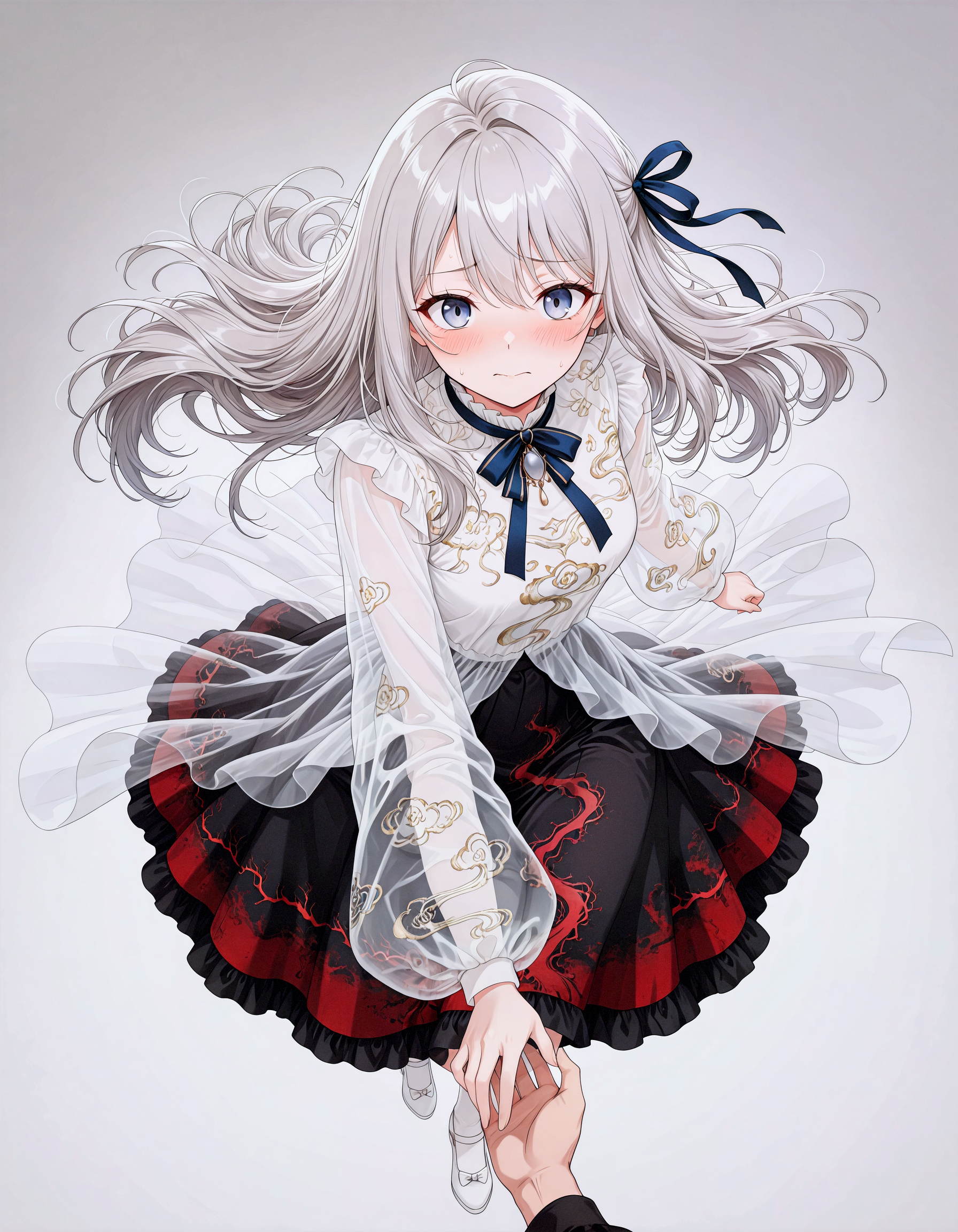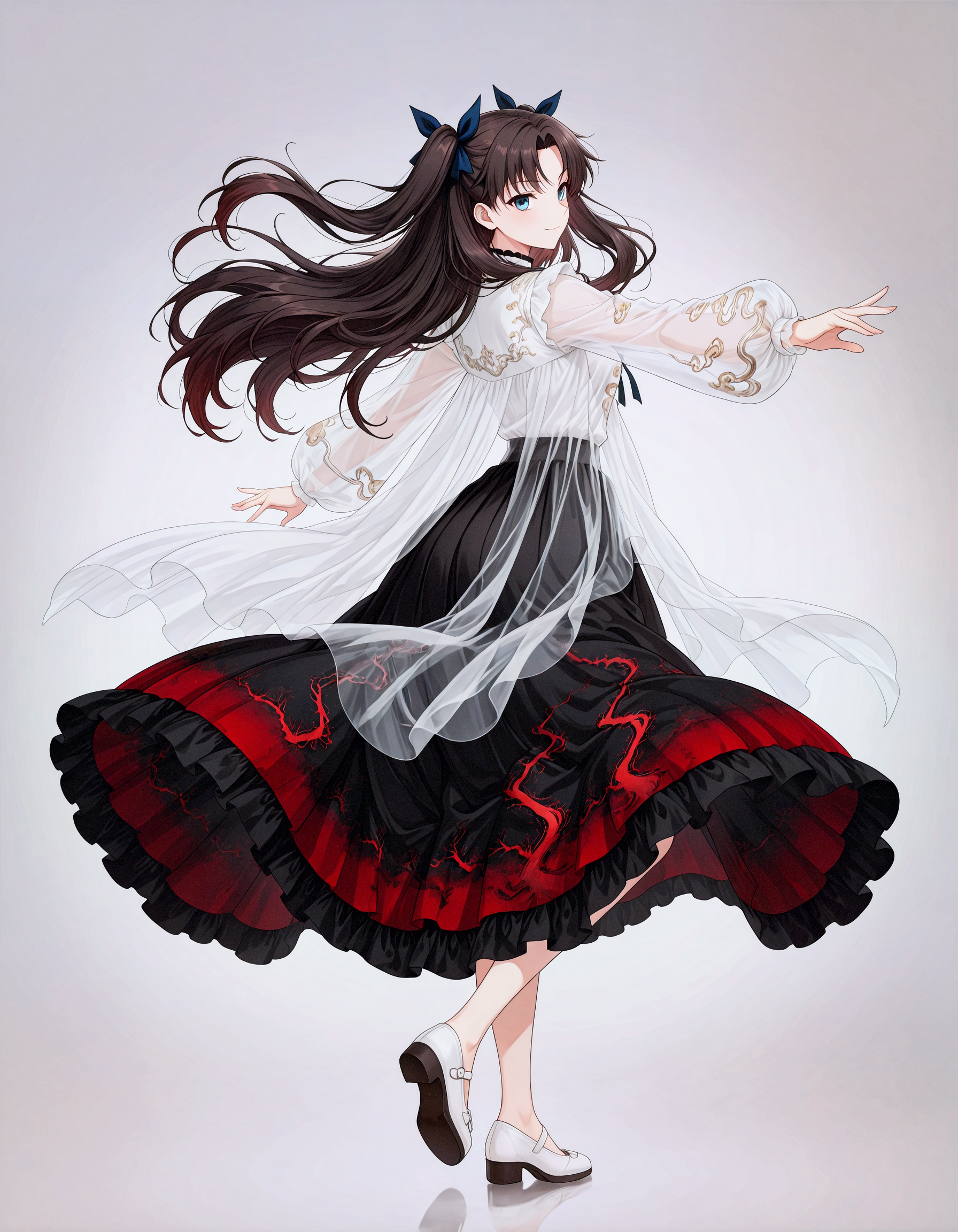 ember in clouds dress, independent outer cover, independent inner skirt, transparent outer + solid inner, overlapping overlay, clear edge boundary, no adhesion, fitted waistline, translucent outer coat, see-through sleeves, see-through, ribbon, white footwear, hair ribbon, black skirt, shirt, long sleeves, blue ribbon, puffy long sleeves, frills,
