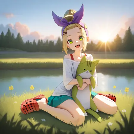YotsHBR, Yto_JP, 금발 머리, 녹색 눈, 일본 옷, 앞머리 뒤로 고정, 꽃무늬, 연한 파란색 기모노, 파란 테두리, 물고기 무늬, 머리 리본, 연한 파란 리본, 연한 파란 헤어밴드, 프릴이 있는 반바지, 파란 반바지, 짧은 기모노, 줄무늬 리본, 빨간 리본, 빨간 리본, 머리 꽃, 머리 장식, 노란 허벅지 스트랩,