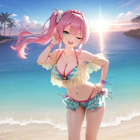 MegumiHBR, Mgm_Swm, 분홍색 머리, 긴 머리, 녹색 눈, 마젠타 테두리, 줄무늬 비키니, 다색 비키니, 왕관 땋은 머리, 층층이 겹친 비키니, 옷 속 비키니, 투명 셔츠, 프릴 셔츠, 노랑 셔츠, 마젠타 비키니, 어깨 드러난 셔츠, 다색 비키니, 헬러넥, 아쿠아 비키니, 커팅 셔츠, 팬티 끈, 비키니 치마, 줄무늬 치마, 옆 묶음 비키니 아래, 가슴 선, 손목 끈, 옆 꼬리 머리, 흰 스런치, 머리 스런치, 땋은 머리, 녹색 보석,