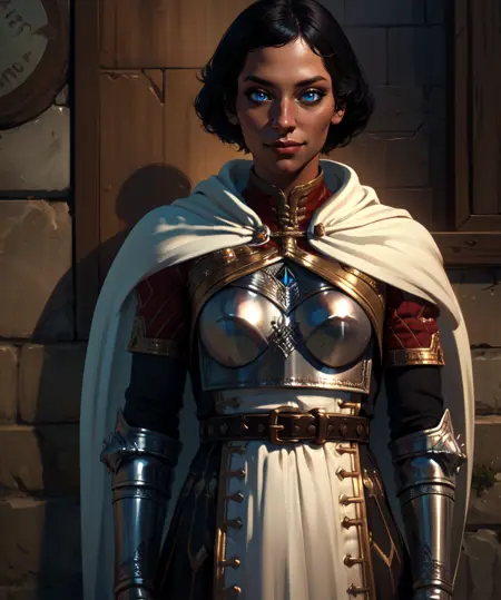 white cape, armor, chest plate, dress, skirt, thigh boots, gloves, or gauntlets, belt,