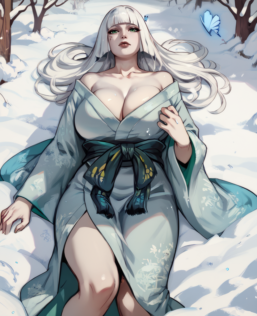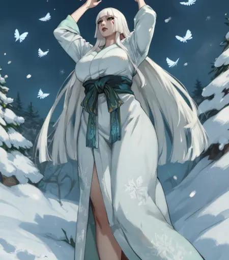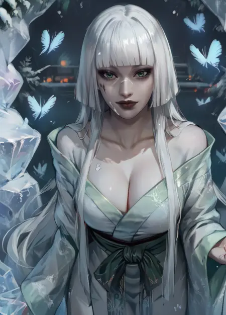 yuki、長い髪、白髪、緑色またはグレーの目、ブランプな前髪、淡い肌