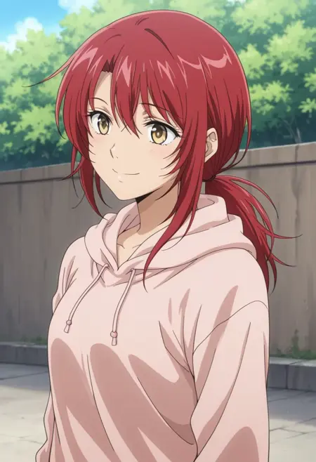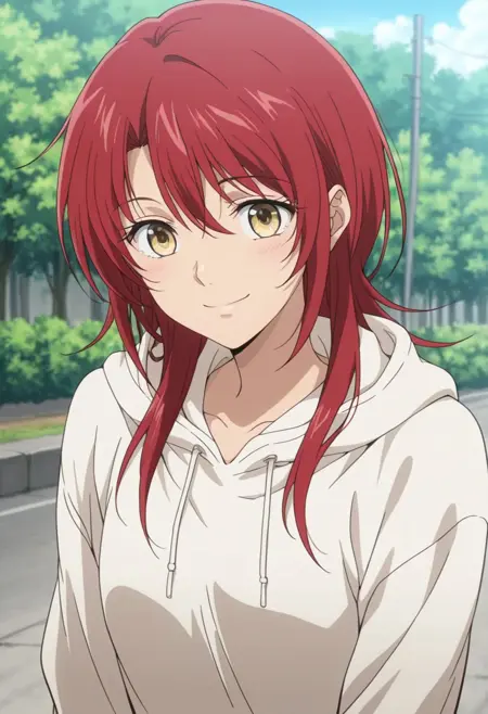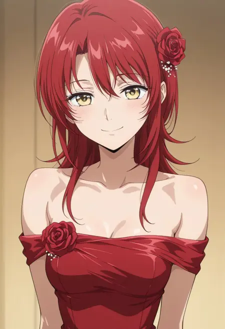 1girl, solo, yellow eyes, red hair, long hair, hair flower, red dress, bare shoulders,
