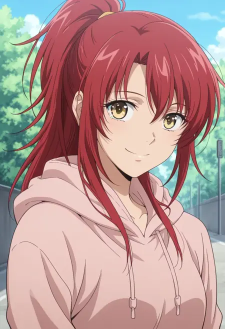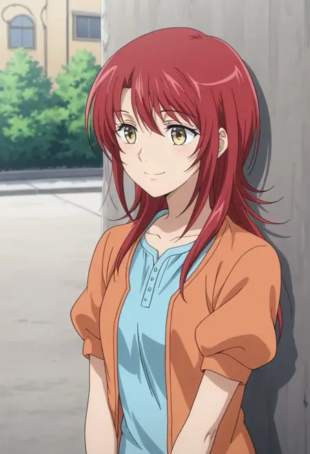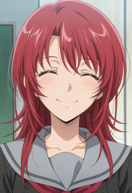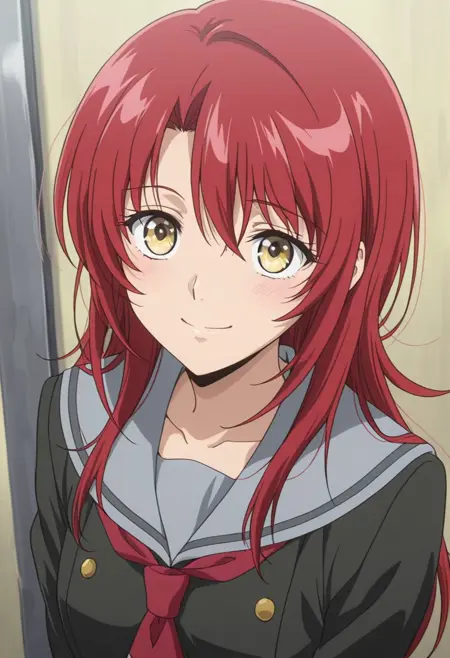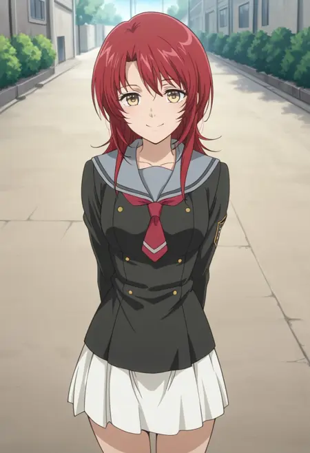 1girl, solo, yellow eyes, red hair, long hair, school uniform, black serafuku, grey sailor collar, red necktie, white skirt,