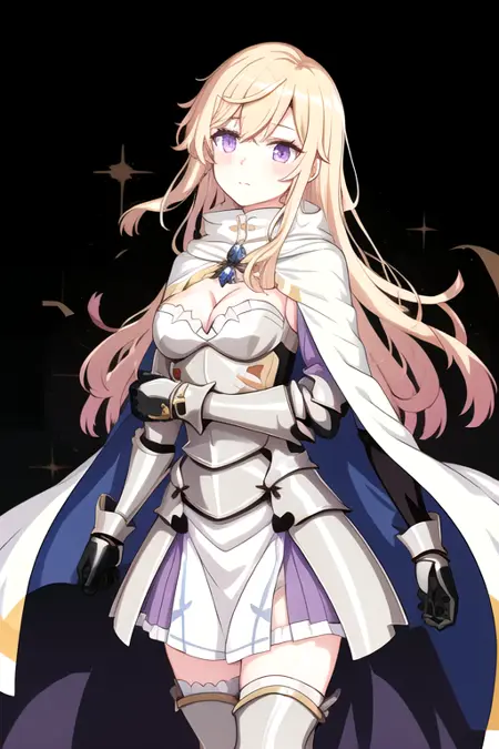 OgierHonkai, 1girl, blonde hair, long hair, medium breasts, white cape, white thighhighs, cleavage cutout, armor, black gloves, knight, gauntlets, white dress, purple eyes, two-sided cape, blue cape, long sleeves