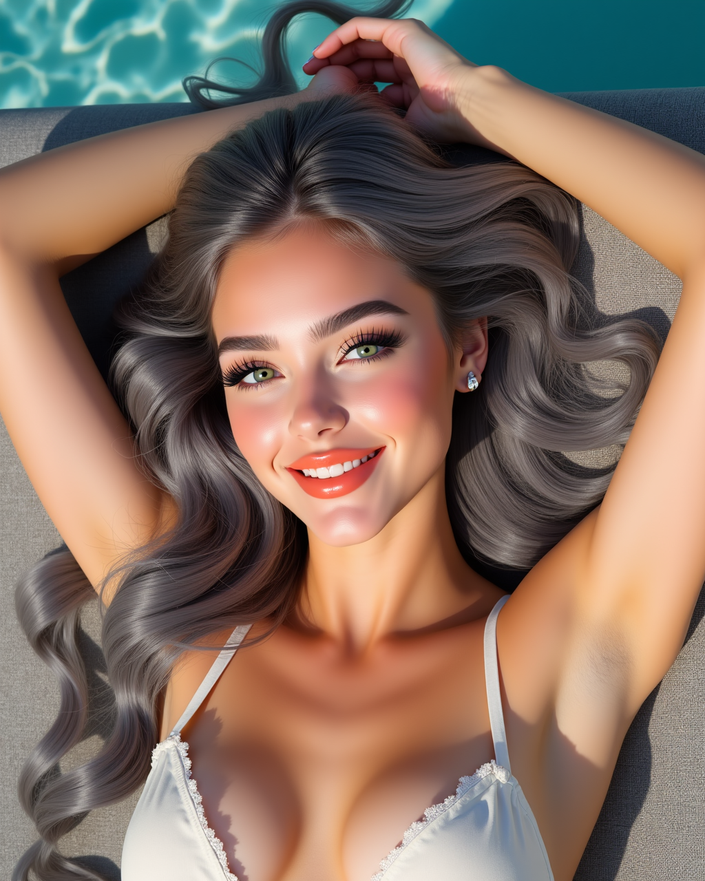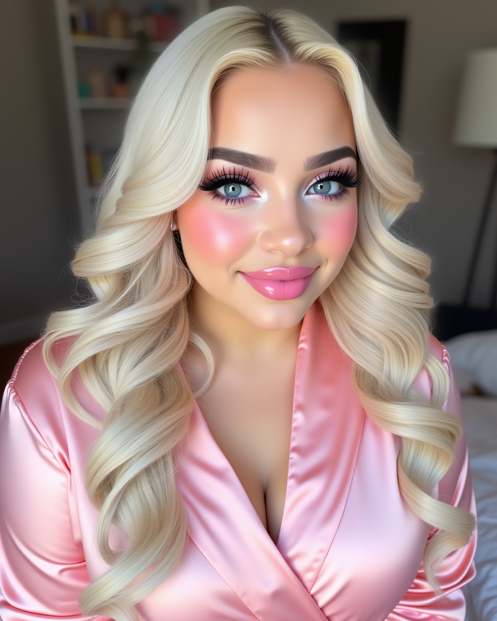 d0ll, photorealistic, massive glassy ice-blue eyes with ultra long spidery lashes, heavy pink circle blush, glossy lips,