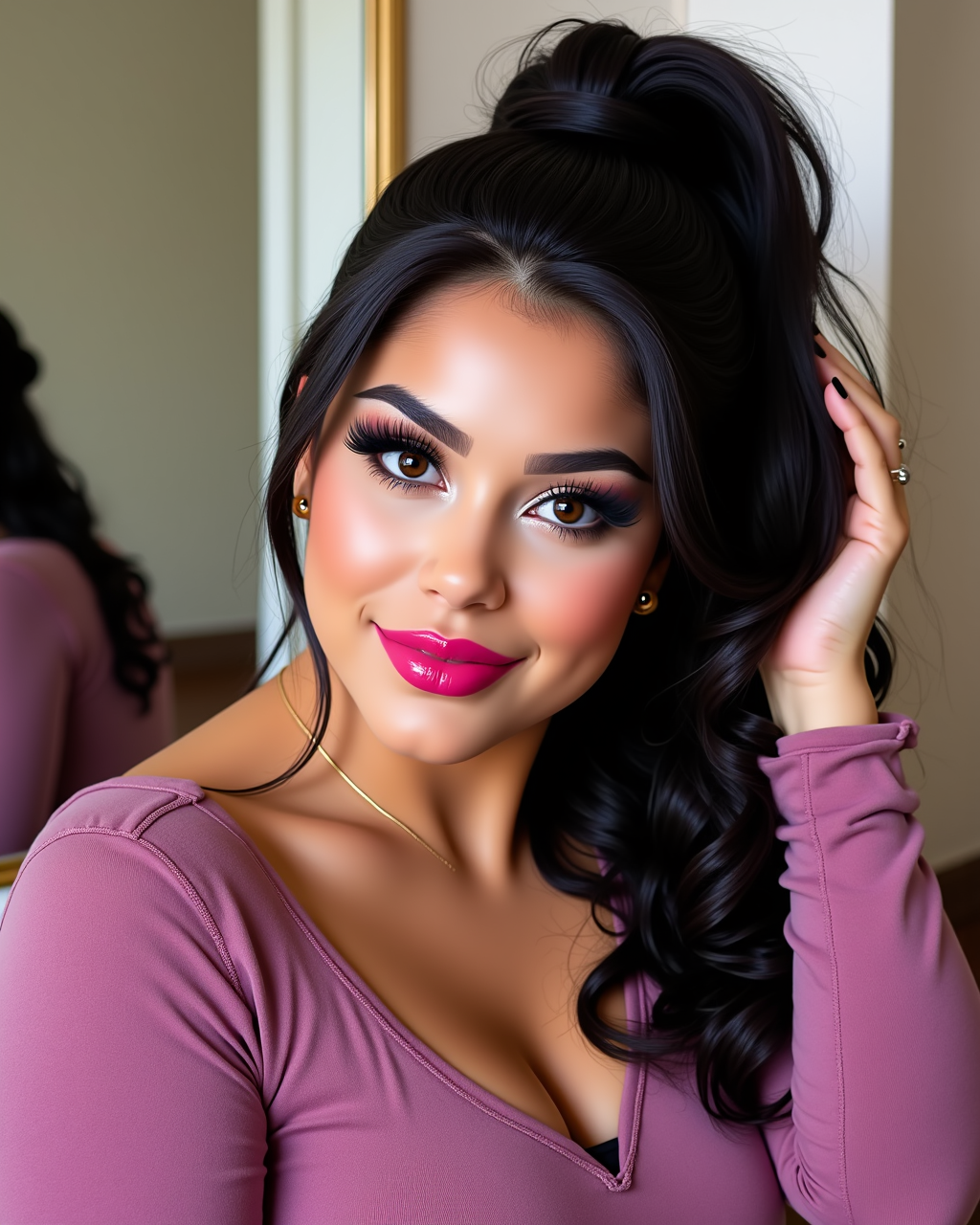 **✅**Long spider lashes, adds subtle pale foundation and bold rosy cheeks.