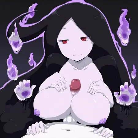 mmghostgirl, 검은 머리, 긴 머리, 창백한 피부, 붉은 눈, 팔 없음, 큰 가슴, 보라색 젖꼭지, 검은 슬라임 몸체, 떠다니는 손