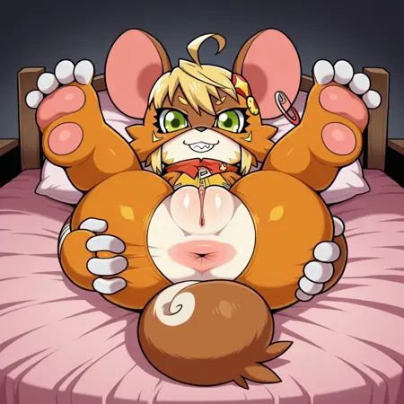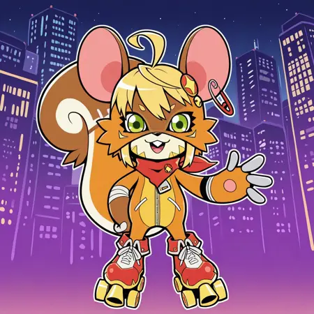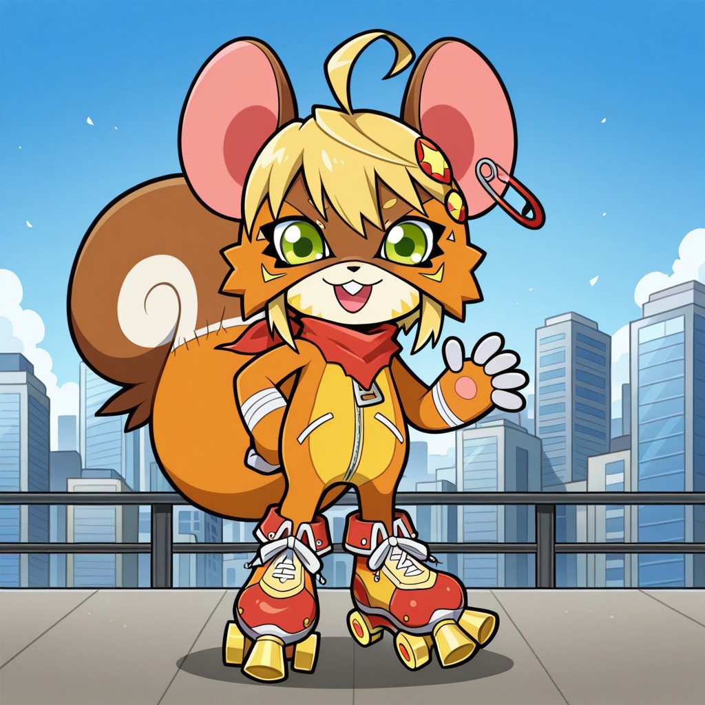 rodent, squirrel, squirrel girl, blonde hair, green eyes, black nose, bucktooth, large squirrel ears, squirrel tail, brown bodysuit, zipper, red neckerchief, mask, red roller skates,