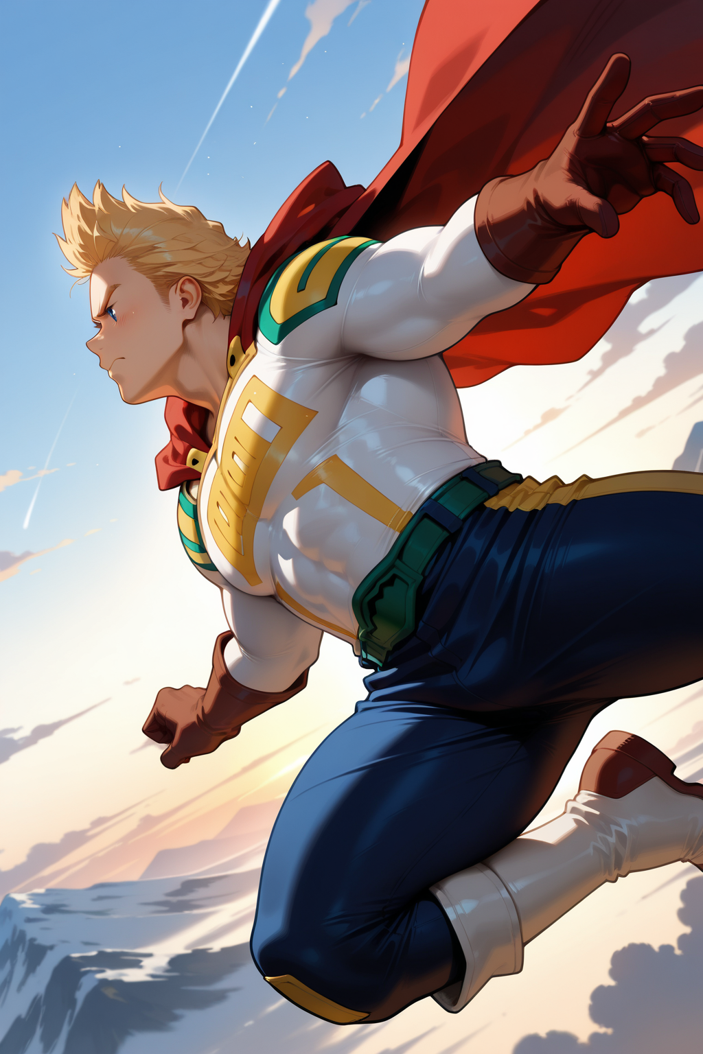 superhero, red cape, white bodysuit, blue pants, mask, white boots, mask, red gloves