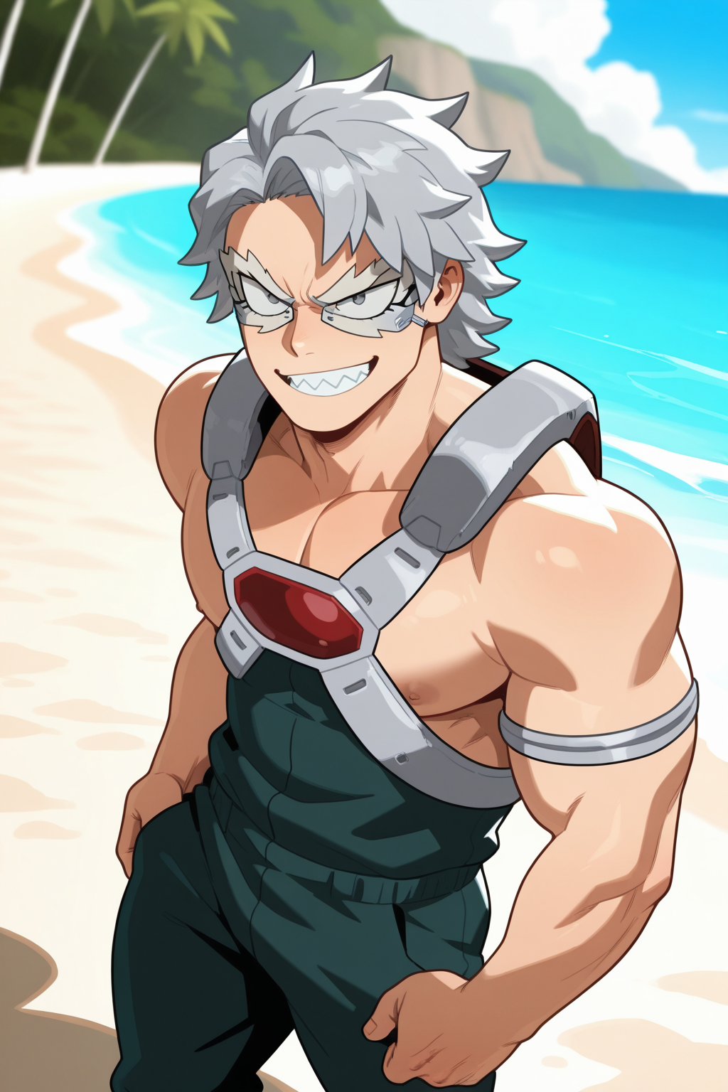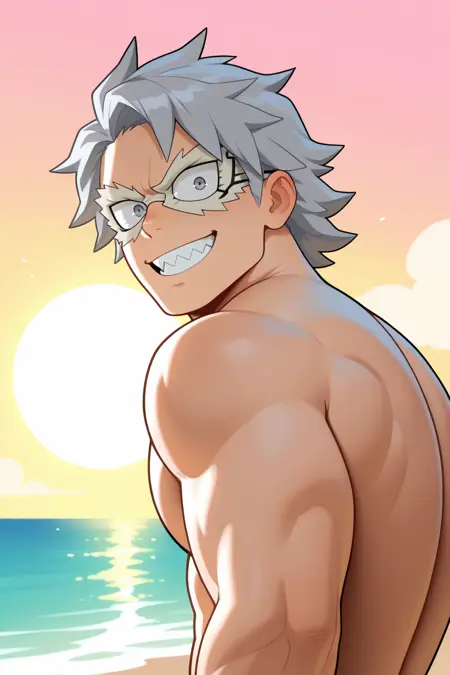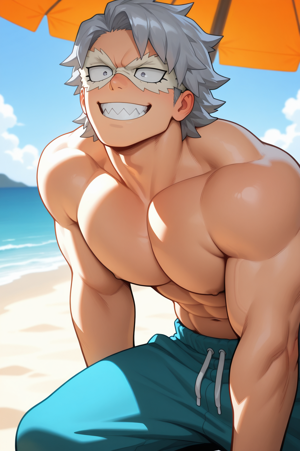 Tetsutetsu、グレーの髪、グレーの目、鋭い歯、ベージュのアイマスク:1.2