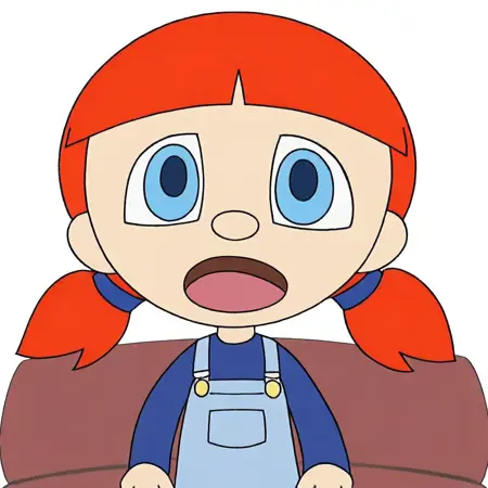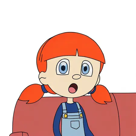 Anita, red hair, twintails, blue eyes, overalls skirt, blue sleeved shirt,