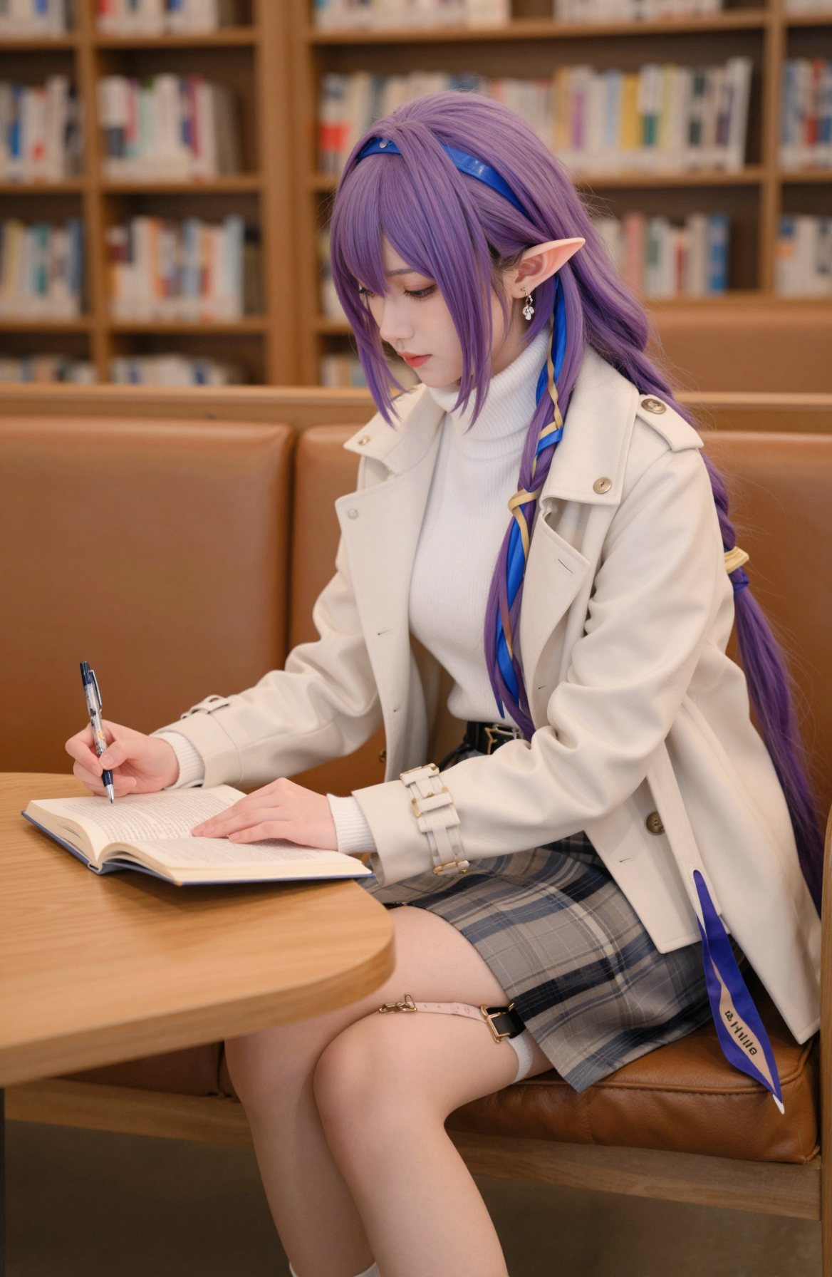 프롬프트: castorice-coffee/star-rail/, 보라색 눈, 다색 머리, 트윈테일, 긴 머리, 엘프, 뾰족한 귀, 터틀넥 스웨터, 흰색 스웨터, 흰색 코트, 열린 코트, 긴 소매, 체크 스커트, 벨트, 회색 스커트, 검은 벨트, 검은 신발, 흰색 양말, 하이힐, 파란색 헤어밴드, 컵을 들고, 일회용 컵, 파란색 핸드백,