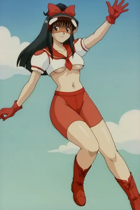 (VenusRed:1.2), 1990년대 (스타일), 레트로 아트스타일, 빨간 마법소녀 세일러 전사 풍자, 허리 노출, 배꼽, 가슴, 언더부브, 헤어 리본, 빨간 발목 부츠, 빨간 악센트가 있는 흰색 크롭탑(볼록한 짧은 소매), 흰색 테두리가 있는 빨간 해적색 넥타이, 빨간 장갑, 바이저, 안경 뒤의 머리카락, 작은 넥타이,