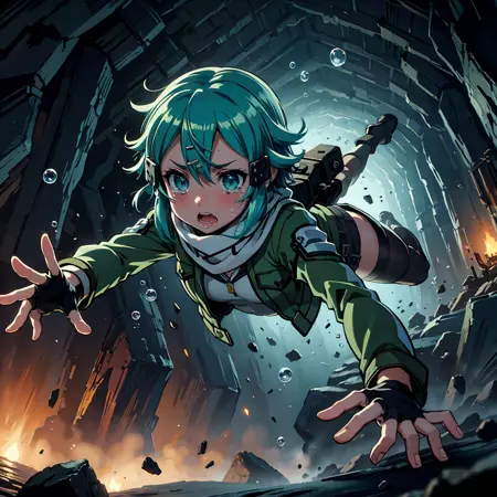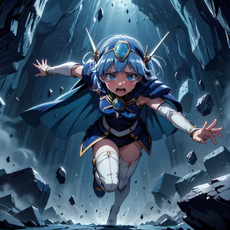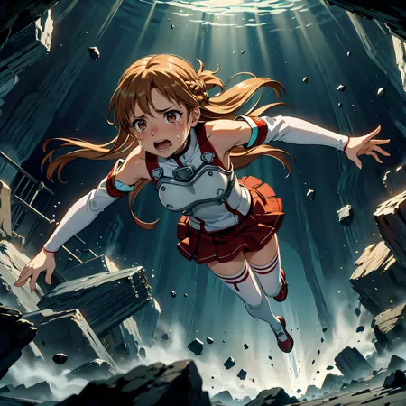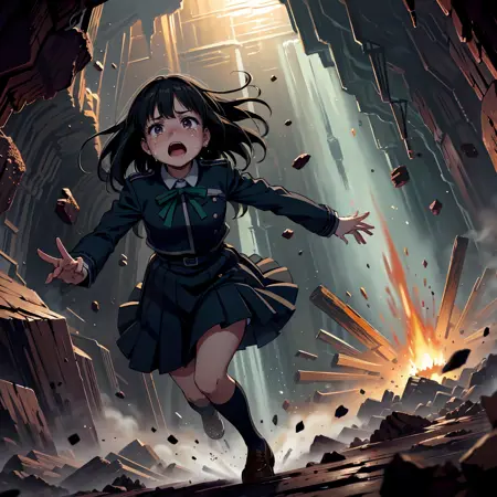 In a dark underground cave that is collapsing, a 2D Japanese anime style scene: A woman with medium black hair and Asian descent, wearing a sailor uniform, is diving, floating and dodging dynamically falling debris and rocks. The cave is dramatically falling apart, with dust and rubble everywhere. The environment is chaotic and dangerous, with only sparse lighting from distant torches casting deep shadows. the woman's face is wince, pout and puffy cheeks. The woman's expression is scared and panicked as she escapes the peril.