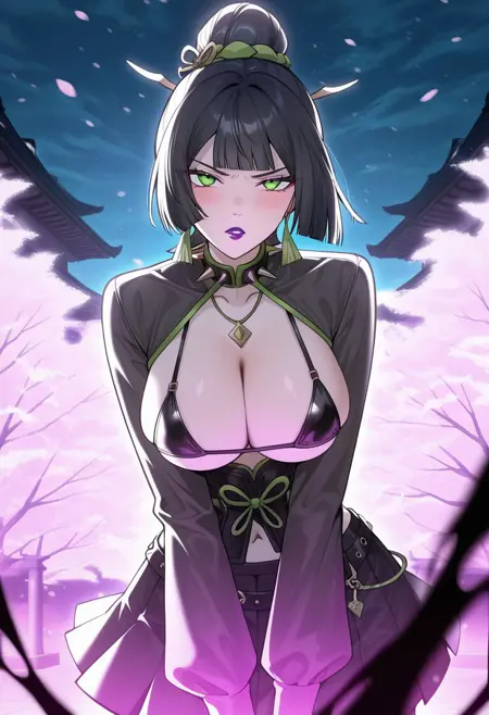 | トレーニングワード | Yang Yanjun, green eyes, straight black hair, bob, short bob, blunt bangs, high bun, elaborate coil, purple lipstick, large breasts, コピーしました! ornate head accessory with two curved horn-like gold pieces extending upward, large inverted geometric triangle earrings, flowing wide oversized sleeves, short black modified high-collared qipao, covering neck, multi-layered prominent green piping and trim, bodice deep cutouts, chest and neckline cutouts, waist and skirt are accented with striking green V-shaped geometric patterns and knots, small purple triangular accents hang from the trim, heavily bright neon-green outline, black fishnet over chest visible over cleavage, black fishnet over upper thighs and legs, tall dark knees boots with a trim visible just below the knee, system of belts and sashes tied around waist コピーしました! Yang Yanjun, green eyes, straight black hair, bob, short bob, blunt bangs, high bun, elaborate coil, purple lipstick, large breasts, ornate head accessory with two curved horn-like gold pieces extending upward, large inverted geometric triangle earrings, flowing wide oversized sleeves, short black modified high-collared qipao, covering neck, multi-layered prominent green piping and trim, bodice deep cutouts, chest and neckline cutouts, waist and skirt are accented with striking green V-shaped geometric patterns and knots, small purple triangular accents hang from the trim, heavily bright neon-green outline, black fishnet over chest visible over cleavage, black fishnet over upper thighs and legs, tall dark knees boots with a trim visible just below the knee, system of belts and sashes tied around waist コピーしました! |