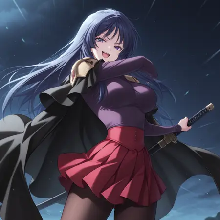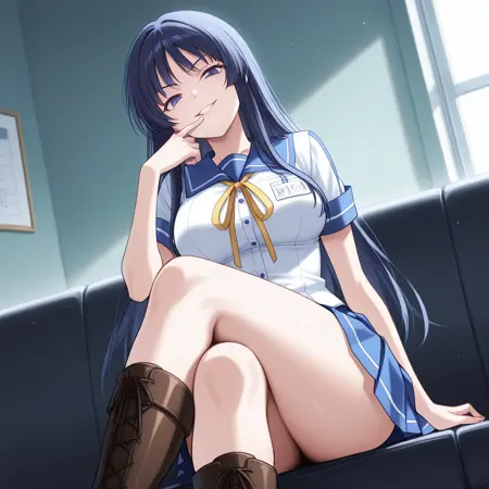 キャラクター: 1人女の子、長い髪、濃い青髪、紫の目、大きな胸、