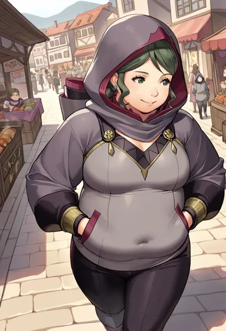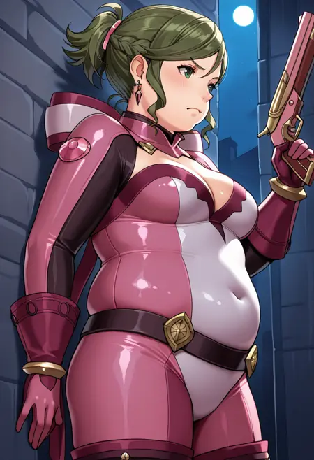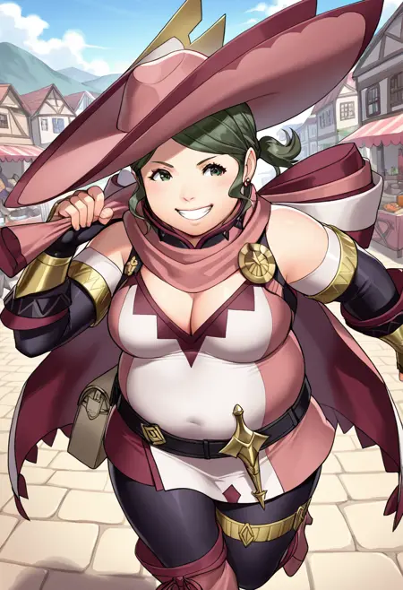 トリガー語: CandaceFE、緑の髪、ポニーテール、サイドロックス、緑の目、ふっくらした体型、イヤリング、ジュエリー、大きな帽子、ピンクの帽子、ピンクのスカーフ、多色のリボン、ピンクのリボン、白いリボン、肩出し、肘まで手袋、ゴールドのガントレット、フィンガーレスグローブ、ツートーンのドレス、ピンクのドレス、白いドレス、短めのドレス、胸元、ベルト、青いクイバー、タイツ、ツートーンのマント、ピンクのマント、白いマント、太ももストラップ、ピンクのブーツ、ハイヒール