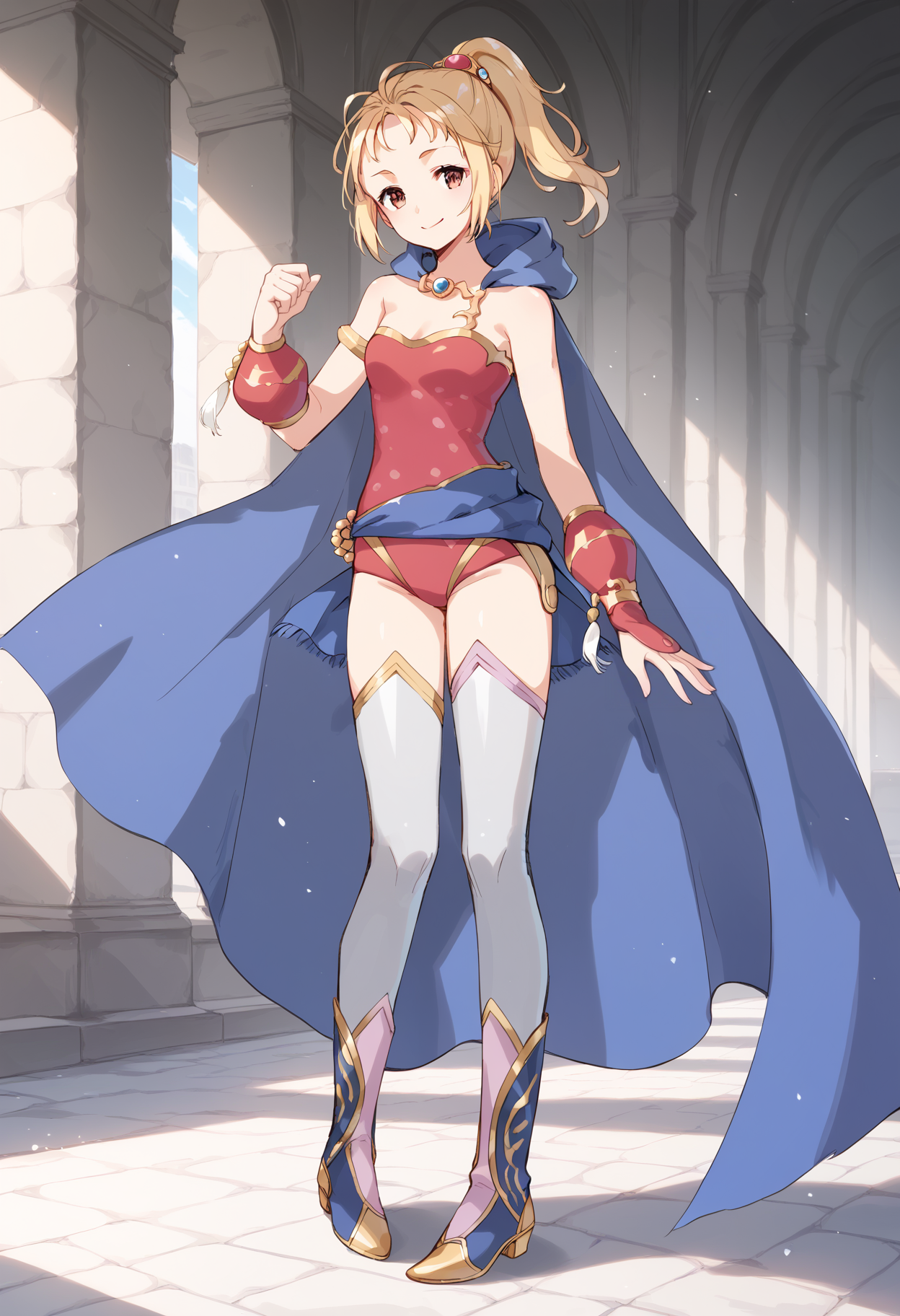 为她的歌剧全曲造型添加 "cape,armlet,gauntlets,pink leotard,sash,thigh boots"。