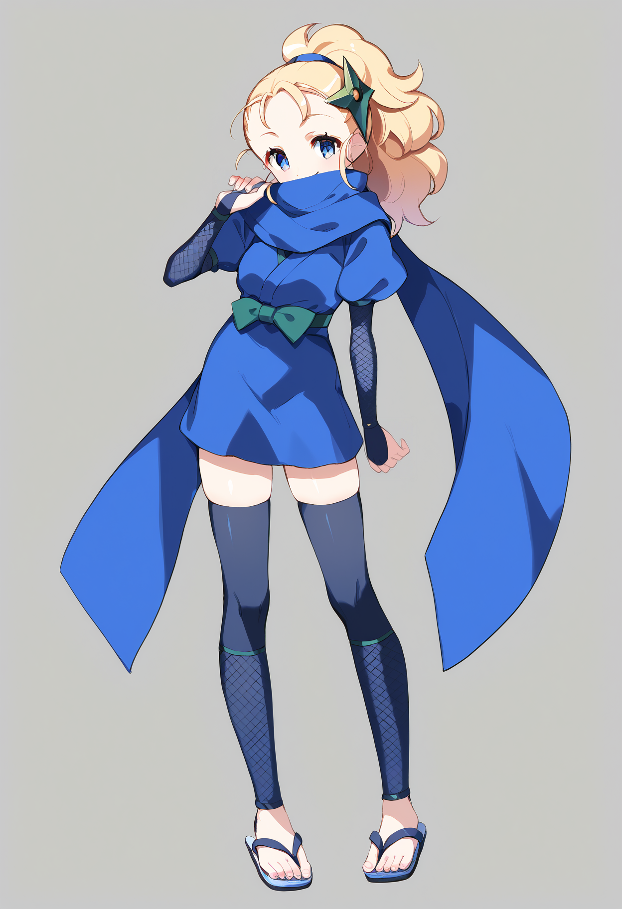 为她的忍者造型添加 "blue hairtie,hair ornament,blue scarf,scarf over mouth,blue kimono,puffy long sleeves,obi,fishnet thighhighs,sandals"。