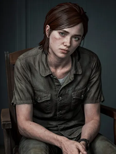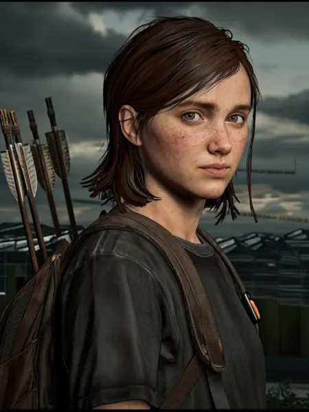 Example Prompt including trigger word: "Ellie_TLOU2, a teenage girl with brown hair tied back and green eyes, wearing a green hooded jacket over a dark shirt and carrying a backpack with a flashlight attached, close-up portrait, smiling gently, looking to the side"