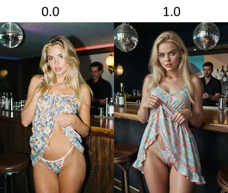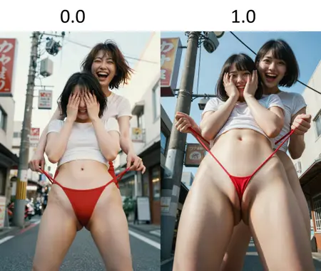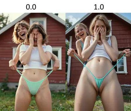 There is one main keyword(wedgie), but all source images was prompted, so natural language works best, and some times to good. Be careful using "close up", "thong", "panties", "pussy-wedgie" etc if you dont want the image to change quite a bit.