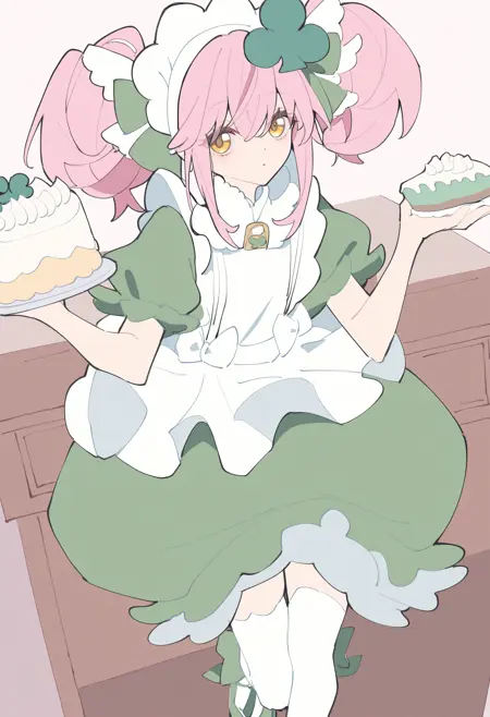梅花:yameng\(meihua\), 1girl, green footwear, green dress, pink hair, white thighhighs, clover hair ornament,puffy sleeves,short sleeves, white apron, puffy short sleeves, maid headdress, sidelocks, short twintails, bubble skirt, green bow, white bow, yellow eyes, footwear ribbon,frilled apron,white headdress,