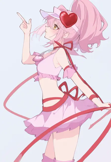 红心:yameng\(hongxin\), 1girl,pink hair, yellow eyes, heart hair ornament, pink socks, pink footwear, visor cap, pink skirt,necklace,pink shirt, red ribbon, loose socks,midrif,crop top
