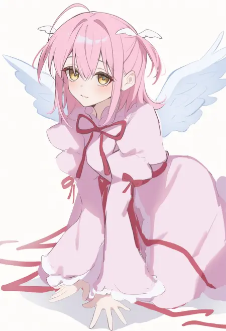 天使:yameng\(tianshi\), 1girl, pink hair, wing hair ornament, pink dress, solo, yellow eyes, angel wings,long sleeves, red ribbon, ahoge,, two side up, puffy sleeves, frills, white wings, juliet sleeves