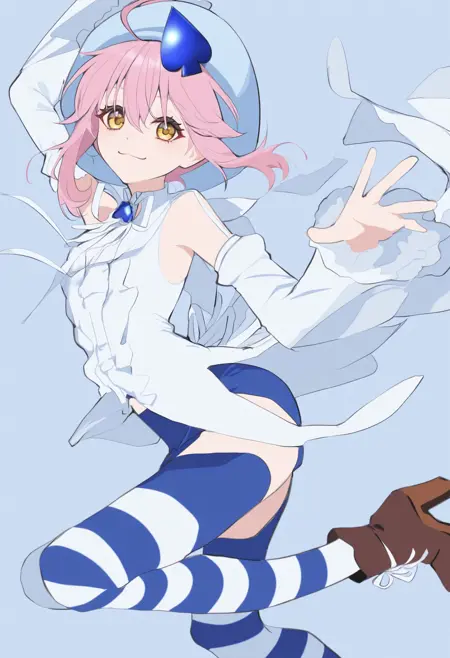 黑桃:yameng\(heitao\), striped thighhighs,pink hair, spade hair ornament, blue headwear, detached sleeves, frilled sleeves, striped clothes, brown footwear, blue shorts,yellow eyes, hat, blue thighhighs, short hair,ahoge, white ribbon, long sleeves, high heel boots, white sleeves,