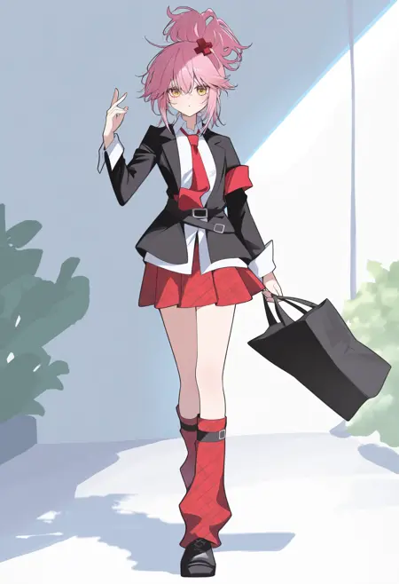 常服:yameng\(changtai\), 1girl, pink hair, short hair, x hair ornament,yellow eyes, red necktie, black jacket, plaid skirt, white shirt, red skirt,collared shirt, armband, black belt,topknot, pleated skirt, leg warmers, loose socks, black footwear,